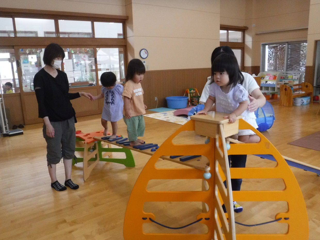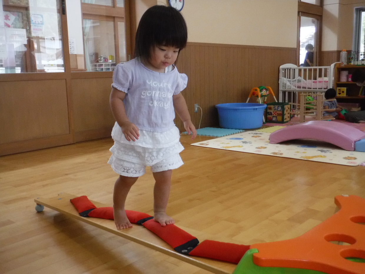 お部屋ではおもちゃで遊んだり、巧技台で体を動かして遊びました。少し怖がりながらも、巧技台に挑戦する姿が見られ、成長を感じました。