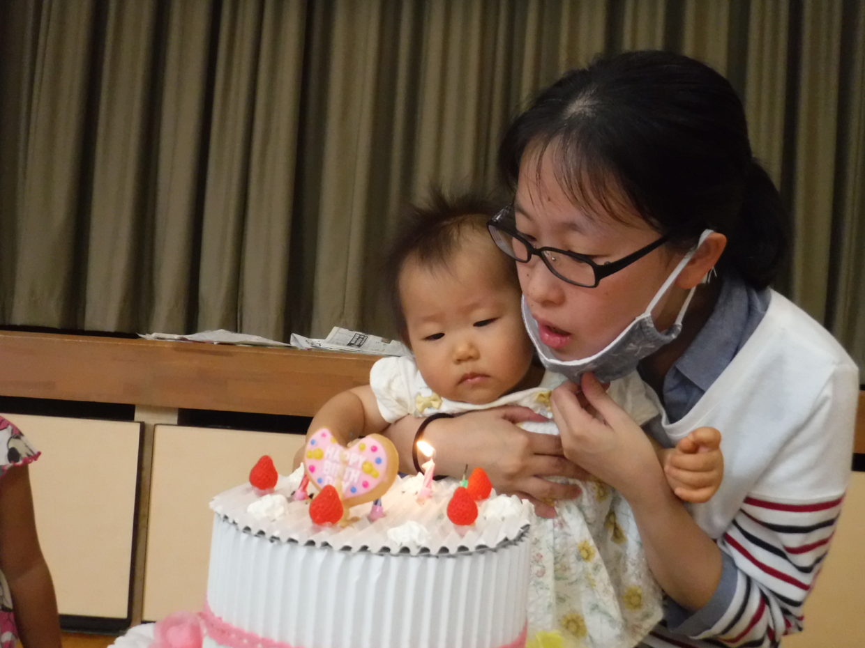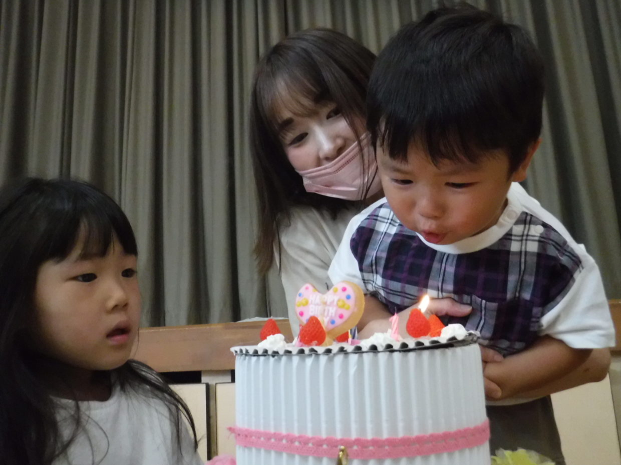 そのあとは、お誕生日ケーキのローソクの火を、お母さんと一緒にふーっと消しました。