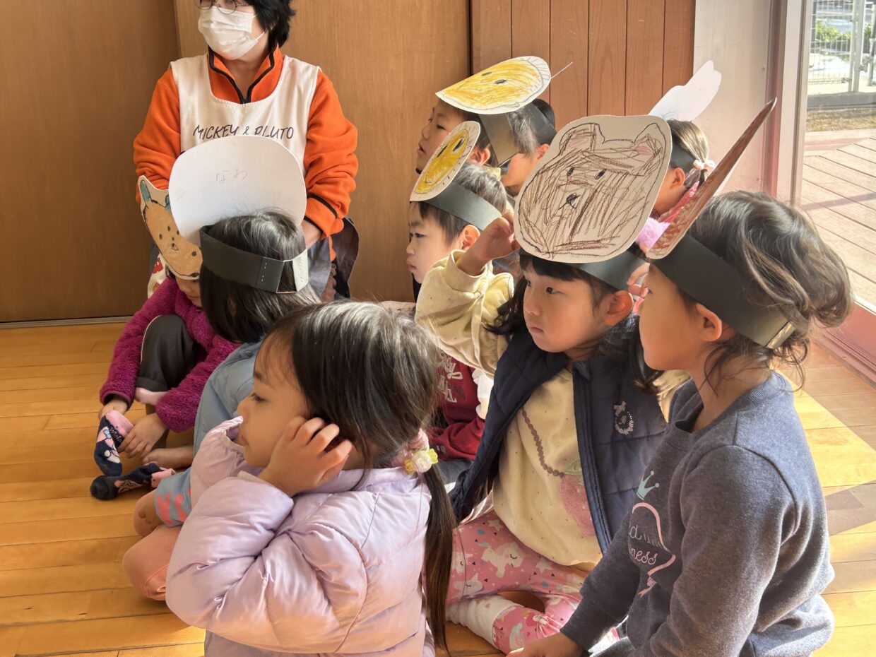 今日は劇ごっこをしました。お面だけでなく、池や背景の木なども子どもたちが「一緒に作りたい!」と積極的に手伝ってくれています。これからもみんなで楽しんで取り組んでいこうと思います♪