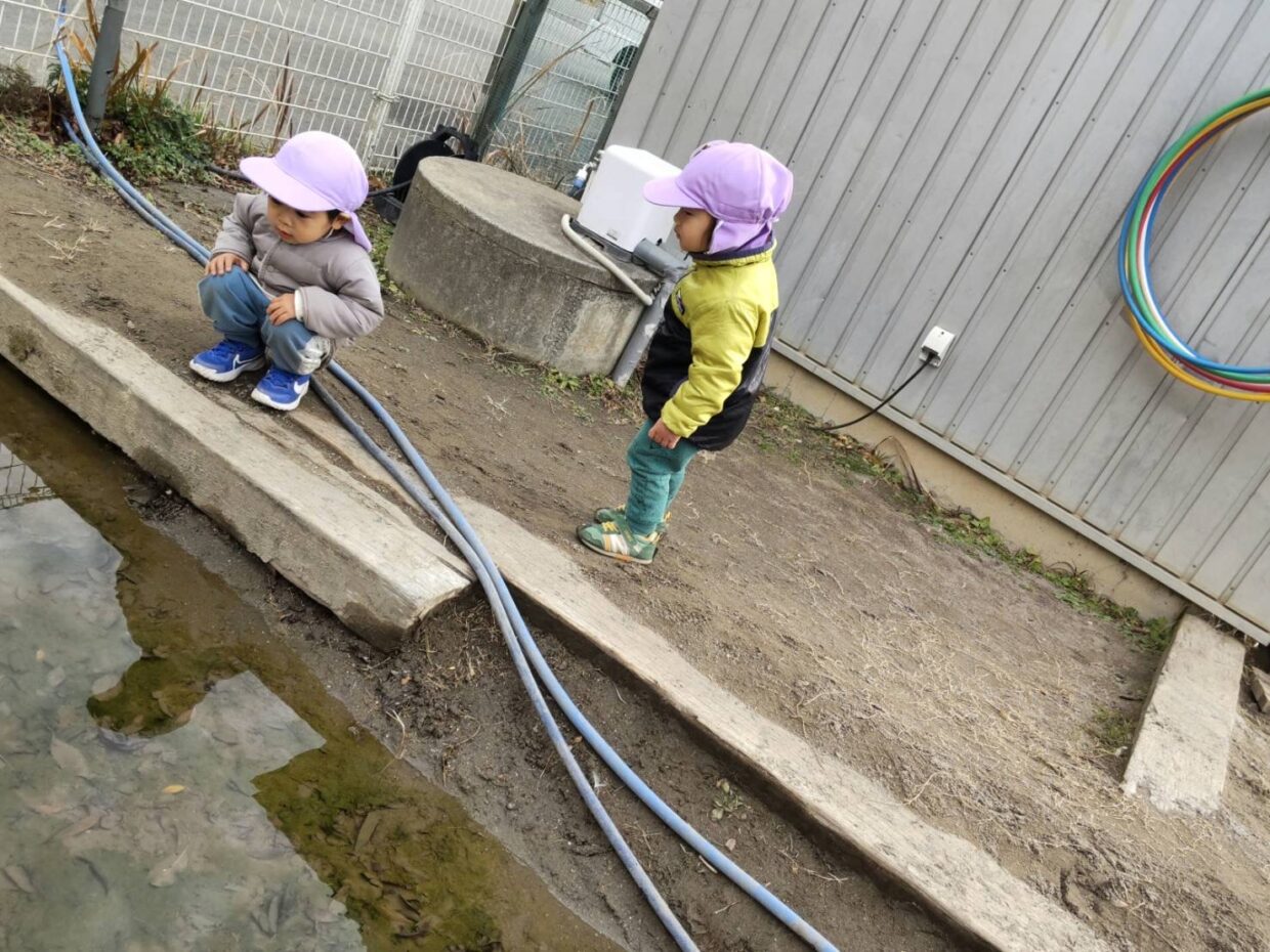 今日は朝から雨でしたが、今週は天気の良い日が続き、戸外に出て遊びました。園庭に行くと、ミニ園庭にはない遊具等があり、興味津々の子どもたち。早速、三輪車や三人乗りの乗り物に友だちと一緒に乗ったり、トンネルを見つけて中に入ってみたりしていました!また、砂場横の小川にも行き、流れる様子をしばらく眺めたりもしていましたよ♪