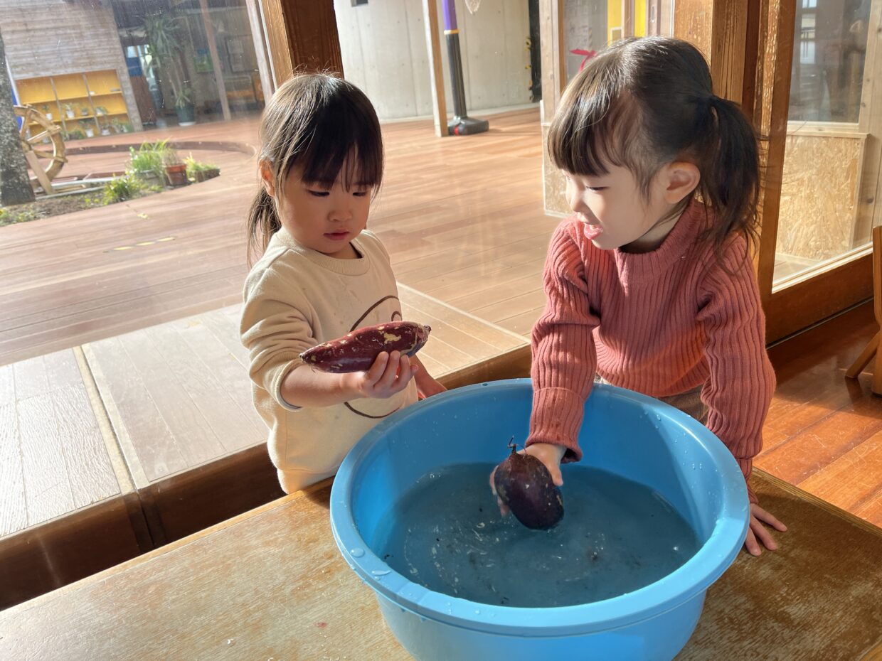 クッキングをしました!お芋を水で洗い、炊飯器に入れ、今回は大学芋を作りました。お芋を洗っている時、「ピカピカになった?」と尋ねると「まだ!」ととってもきれいに土を落としていましたよ。