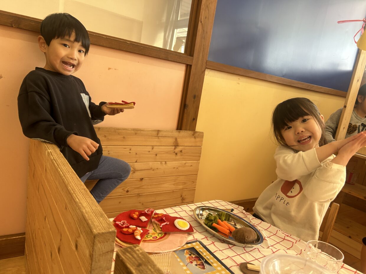 お客さんと店員さんに分かれてごっこ遊びを楽しんでいますよ。