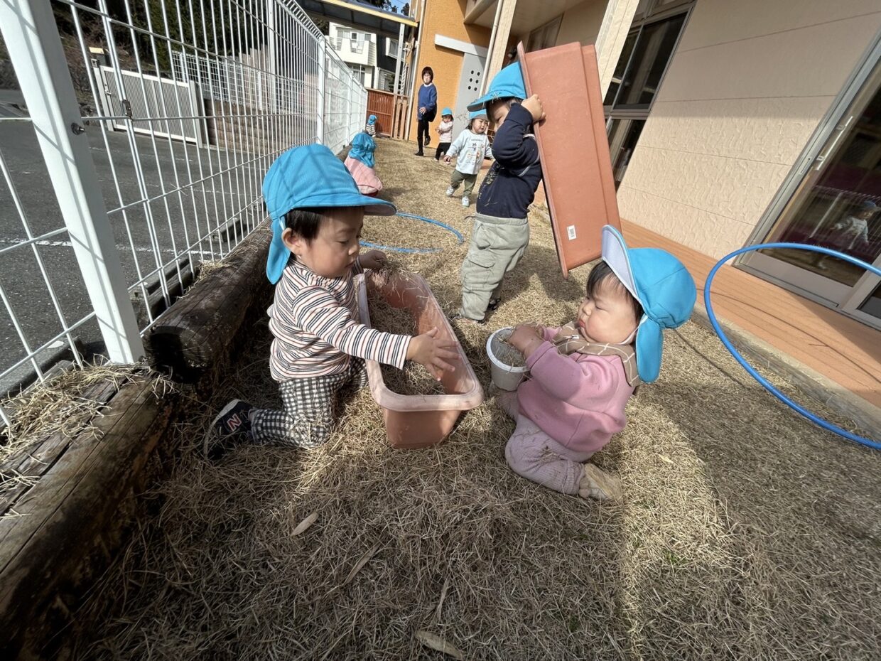 外に出ると、芝や木の感触を楽しむ子どもたち。芝を容器に入れ、腕にかけて「ばいばーい!」と言いながら歩行する子どもや、一生懸命プランターに入れていましたよ。また、友だちが木を触っているのに気付き、一緒に触る姿が可愛らしかったです♪