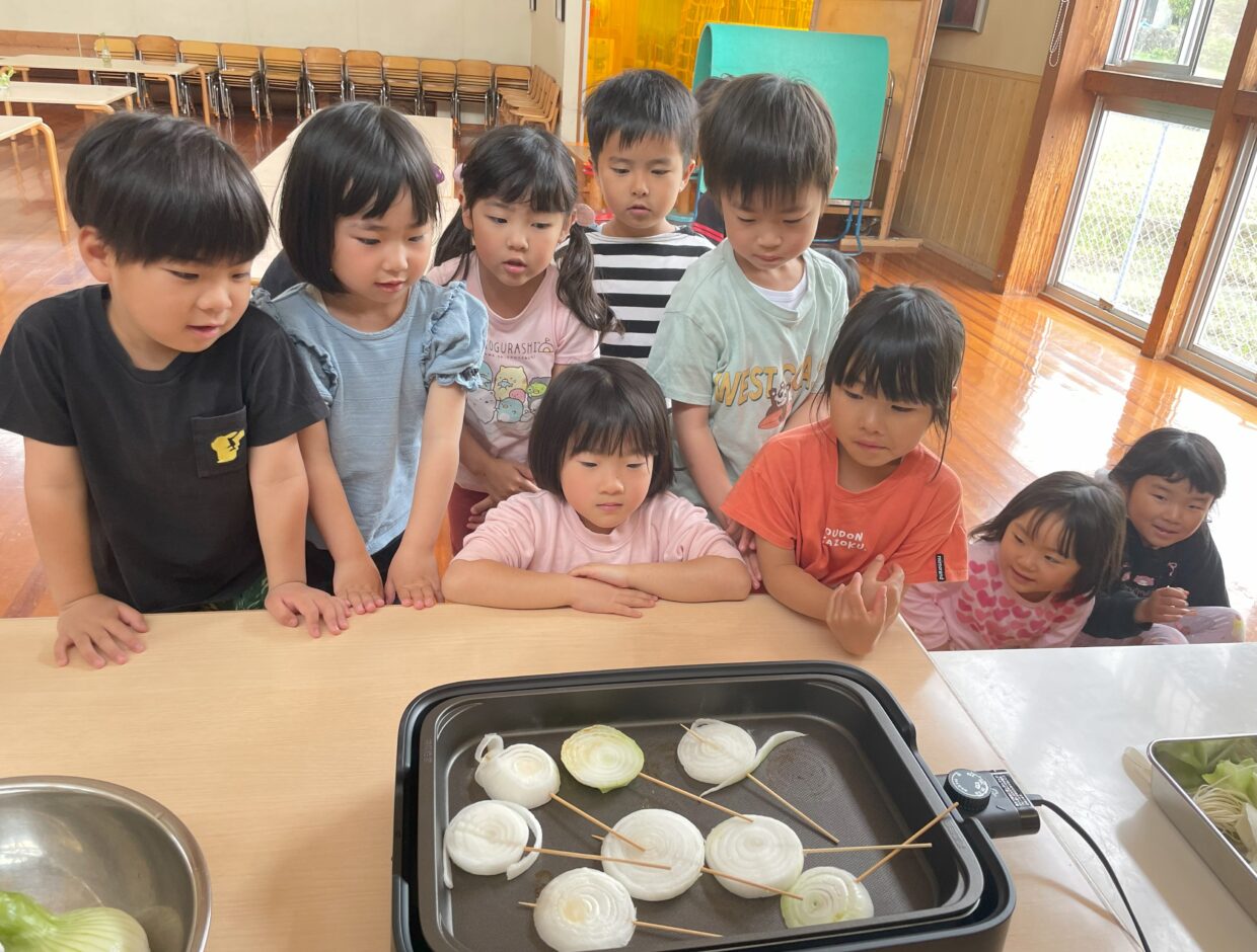 収穫した玉ねぎをすぐにホットプレートで焼くと、「いい匂い!」