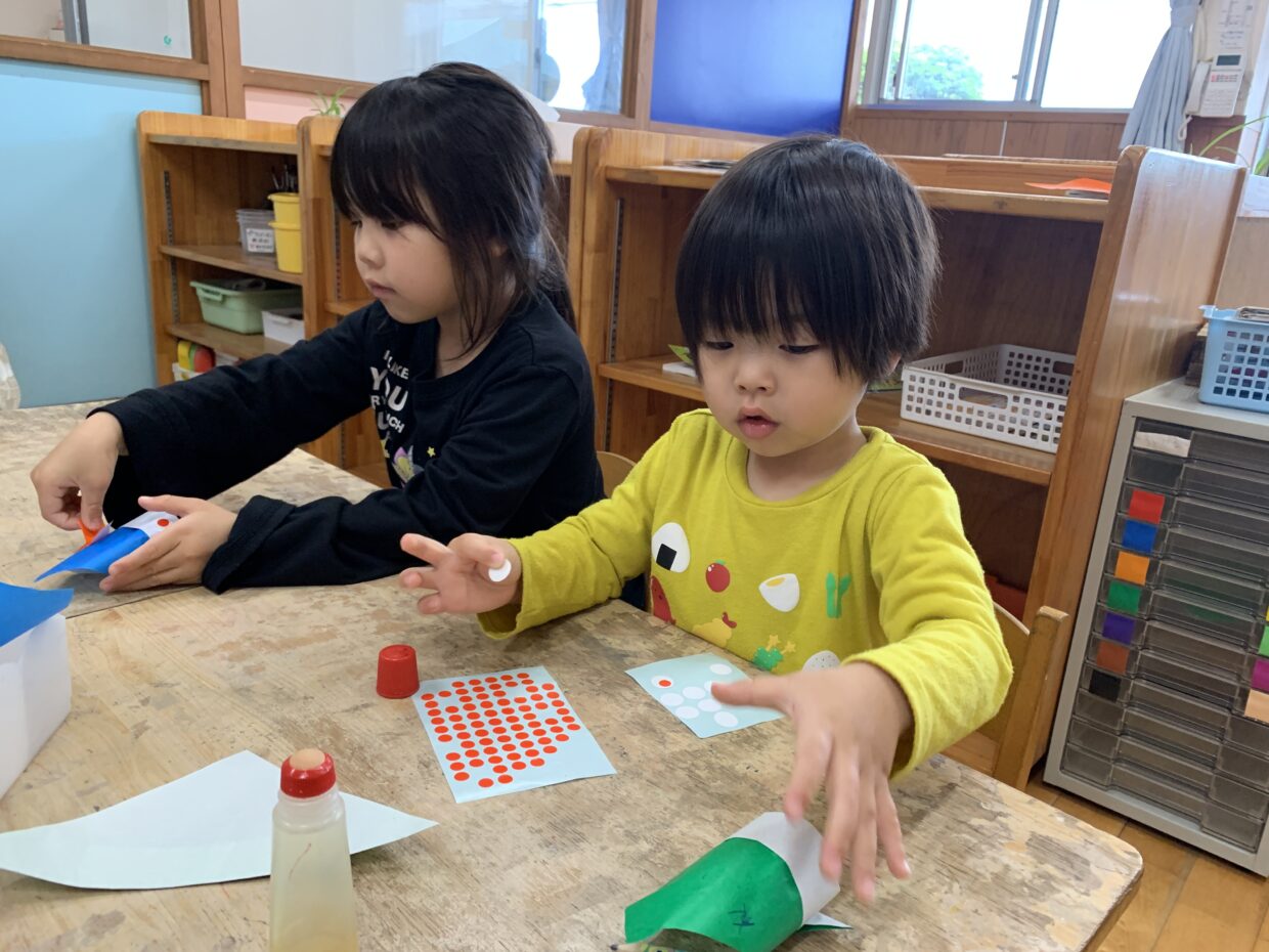 保育者の見本を見ながら折ったり、のりやシールで貼ったりとそれぞれ素敵なこいのぼりができていましたよ。