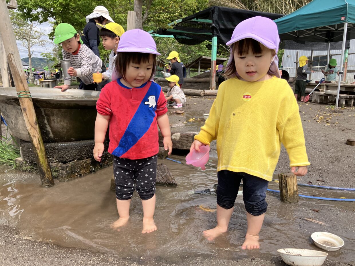 日に日に気温が上がり、少し汗ばむようにもなってきましたね。園庭に行くと、井戸や小川の所が大好きな子どもたち。井戸の水を汲んでみたり、裸足になって小川の中に入ってみたり、気持ち良さそうでしたよ♪