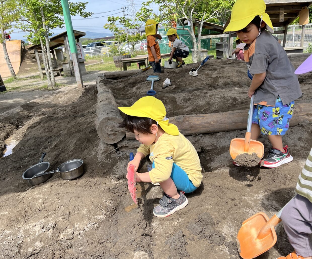 ミミズやダンゴムシを見つけて、友だちと観察したり、お家を作ってあげたりする姿が♡また、砂場では、川や山等、思い思いに作って楽しんでいますよ!