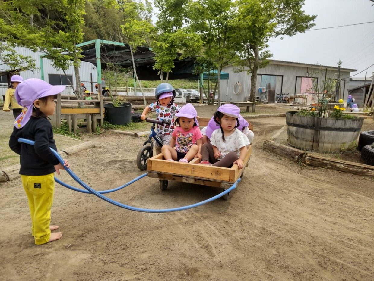 今日は雨が降ったり、曇ったりの天気でしたが、今週は天気の良い日が続きましたね。園庭では、乗り物に乗って遊ぶことが大好きな子どもたち。一人で乗ったり、数人で交代しながら引っ張ったり乗ったりしながら、楽しんでいます。散歩では、園裏の道を通り、坂道を登ったり下ったり、しっかり歩いていましたよ。