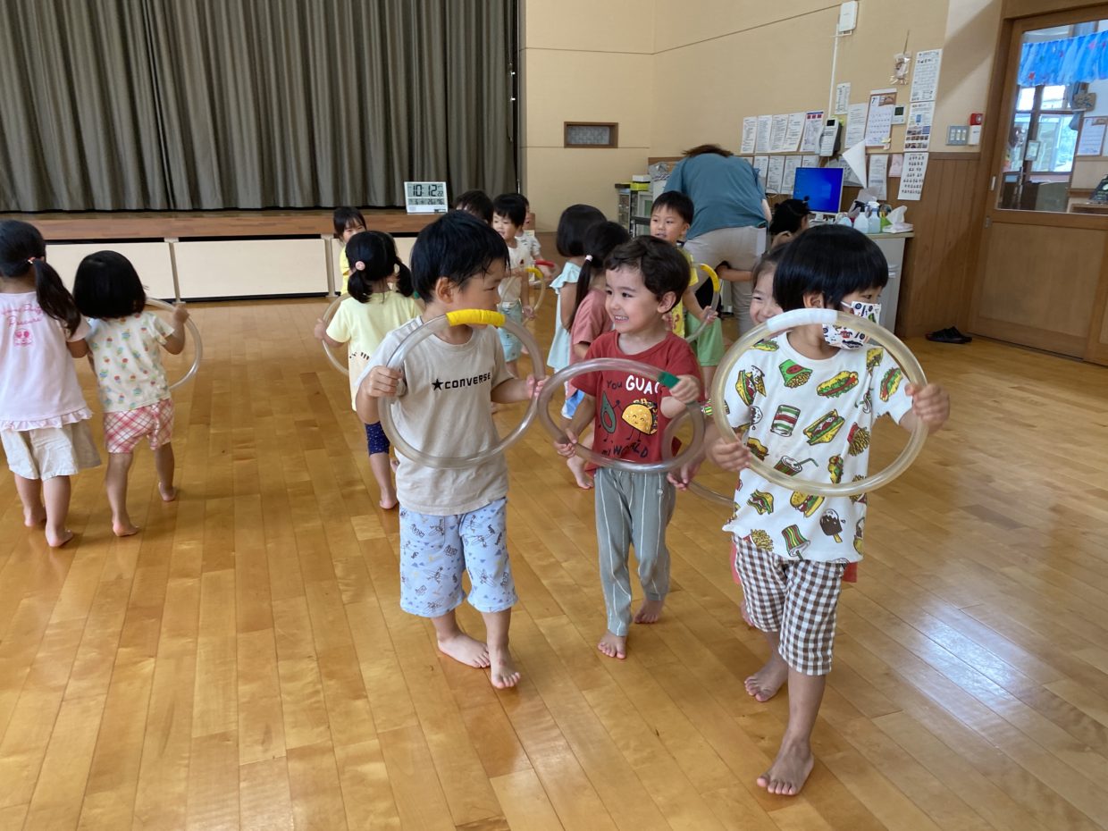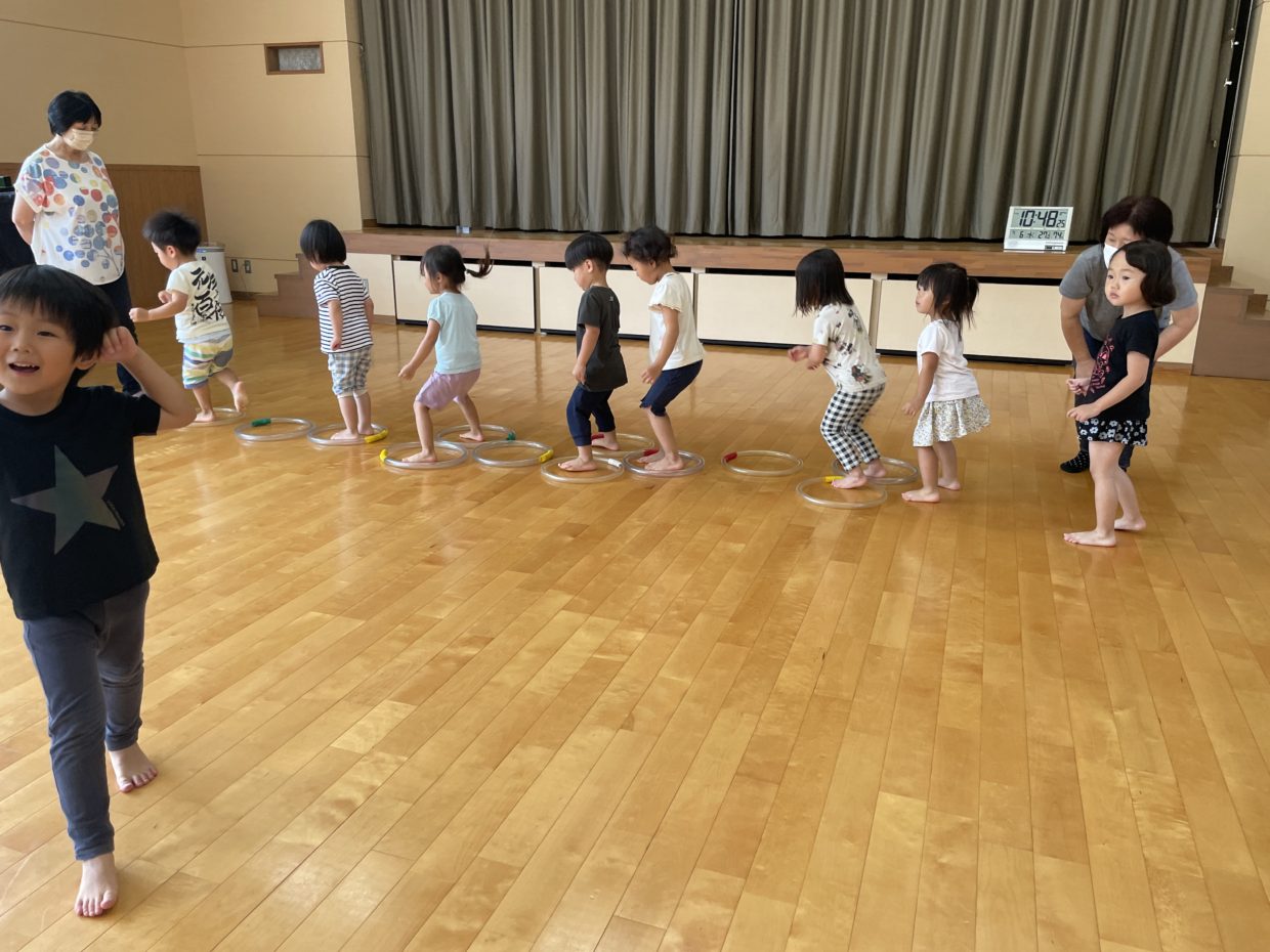 今日は、リトミックがありました。ピアノの音に合わせて輪っかを持って止まったり、歩いたり・・・友だちと一緒に楽しんでいましたよ!また、前回した「けんけんぱ」もみんなで一列に並び上手に飛んでいましたよ。その後は輪になり、ボールを転がして遊びました♪