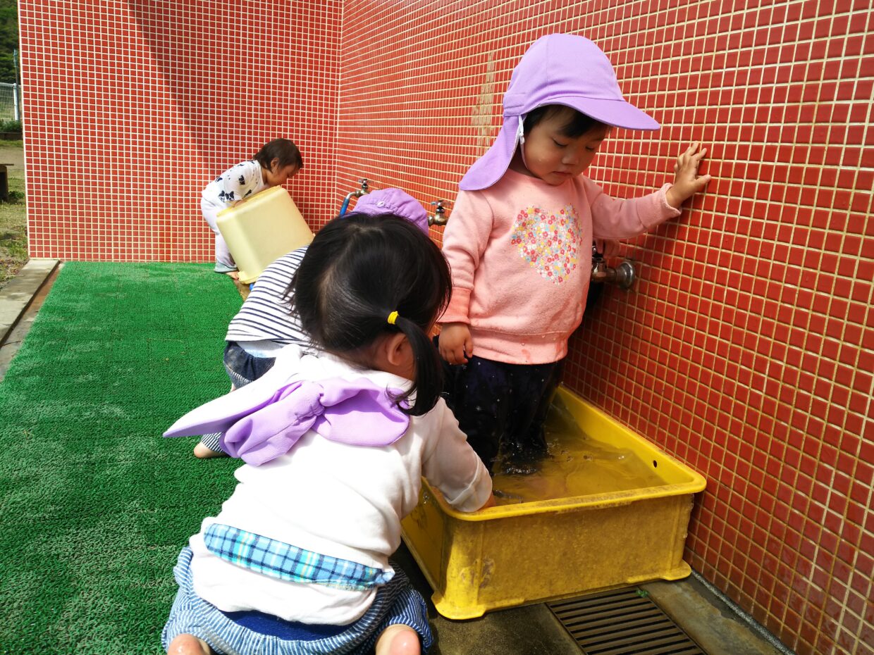 今週は天気の良い日が続き、戸外で遊ぶ機会を多く持つことができました。ミニ園庭に行くと、築山に登ったり、砂場で遊んだり、草花を摘んだり、様々な遊びを楽しむ様子が見られました、。また、桶に水がたまっていることに気付き、近くに行って触ってみたり、中に入ってみたりもしましたよ!遊びの途中には、コップでお茶を飲み、水分補給もしました。