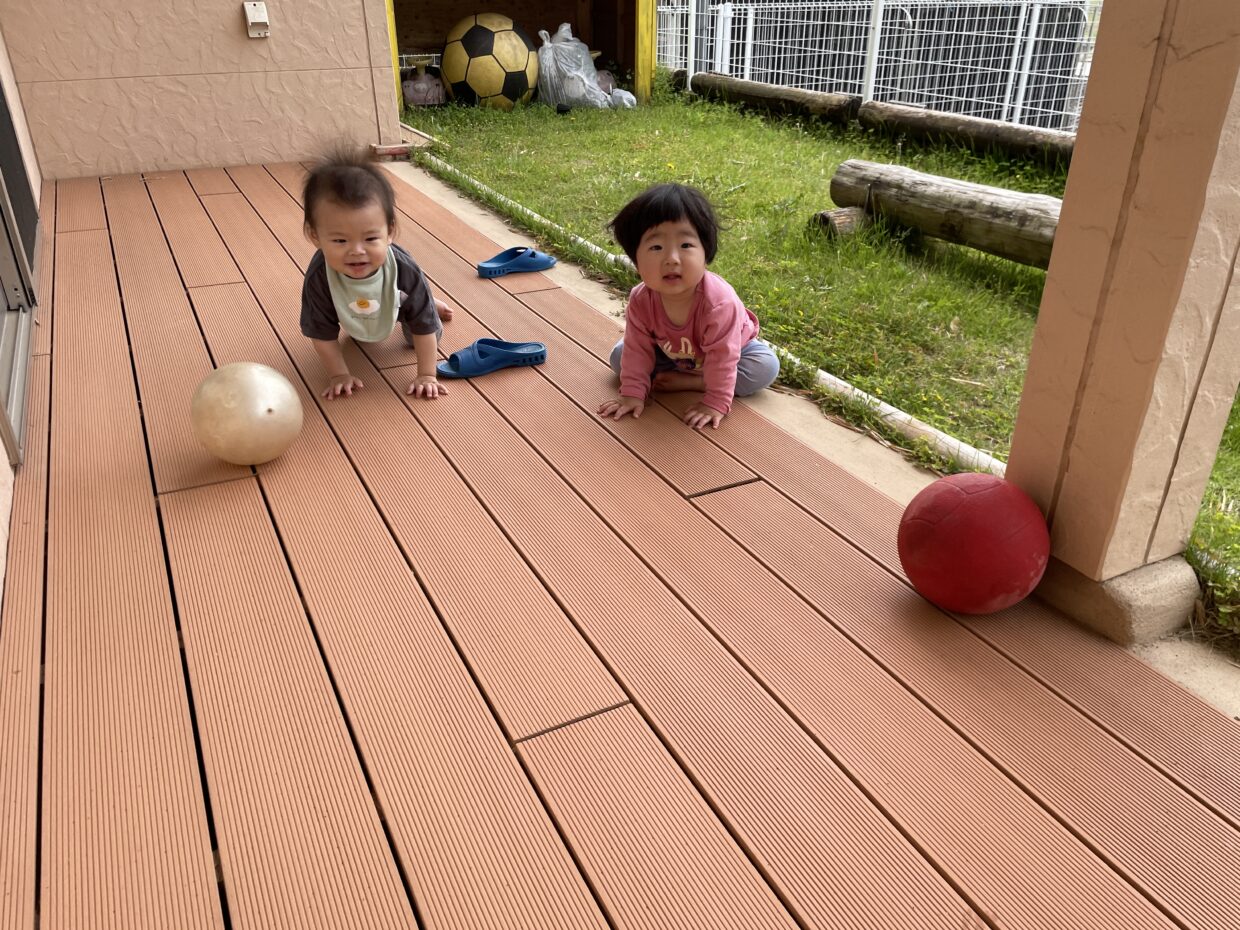 子どもたちはボールが大好き♪ひよこ組にある、大きなボール。転がってくるのを見て、驚いたり、不思議そうに見つめたり、追ったりと興味津々な子どもたちです。驚いている子どもも、お友だちが触っているのを見て、触れてみようとしたり、保育者と一緒に触れて喜ぶ姿も見られますよ。