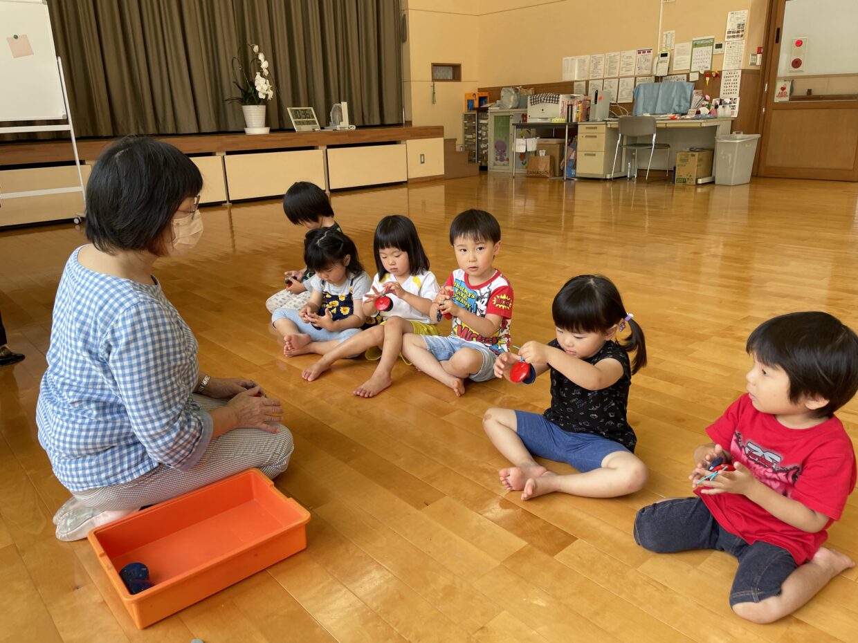 今日はリトミックがあり、カスタネットを使ってのリズム打ちをしました。ピアノの音や先生の合図に合わせて音を鳴らすことが出来ました。カスタネットを持つ際、友だちに「こうかな?」と持ち方を聞くお友達や、持ち方を教えてあげるお友達の様子が見られましたよ。とても楽しそうに参加していました♪