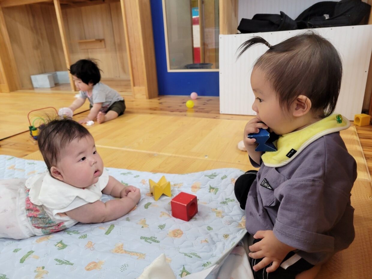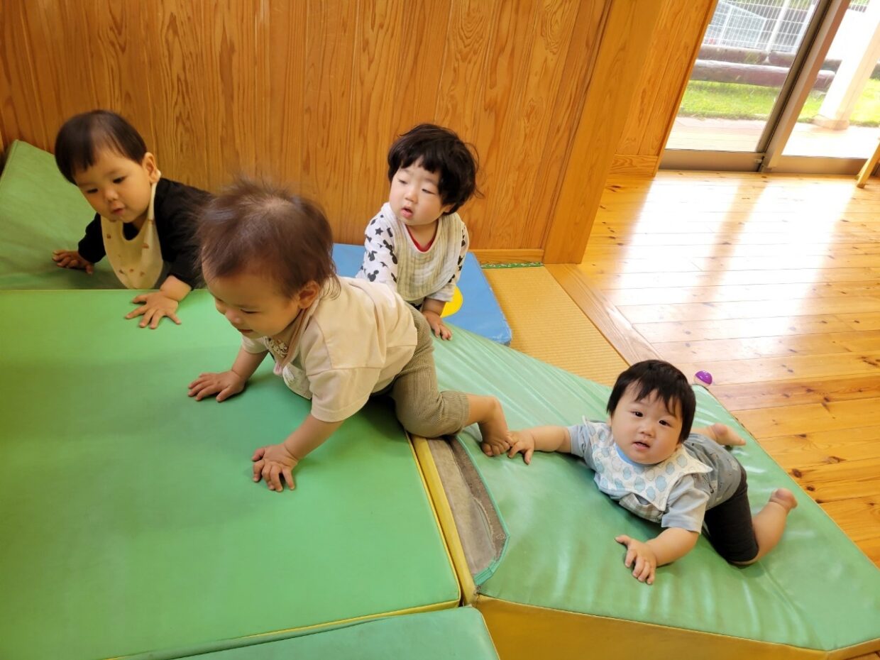 体を元気に動かすことが好きな子どもたち。初めはドキドキした表情だった子どもも、友だちが楽しんでいるのを見て、真似して遊ぶ姿がありました♪今では、スポンジすべり台がお気に入りで、嬉しそうに登ったり降りたりを楽しんでいます!また、友だちに興味を示す姿も見られだし、目をじーっと見つめ合ったり、玩具を手渡す様子もありますよ。