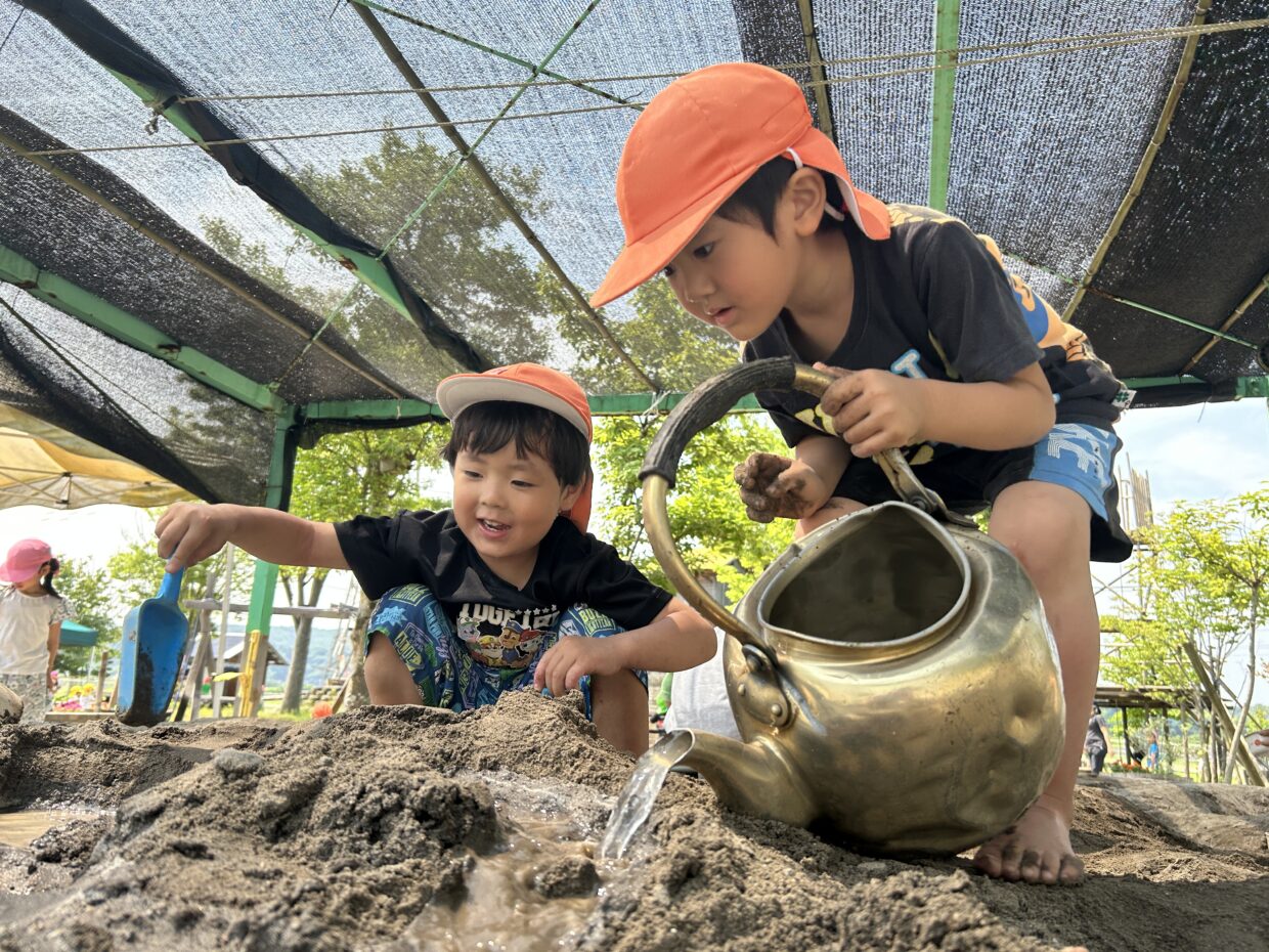 また園庭では砂場では穴を掘って水を流し入れ、その様子を友だちと観察したり、大きな泥団子を作って団子屋さんをしていました。