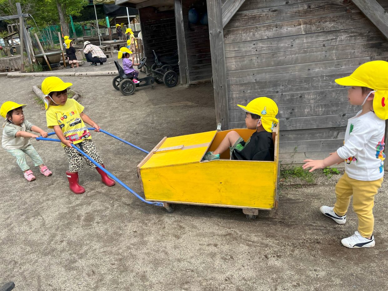 園庭では、今日も元気に遊ぶ子どもたち!みんなで力を合わせて木の乗り物を引っ張ったり、後ろから押したりする様子も見られましたよ♪