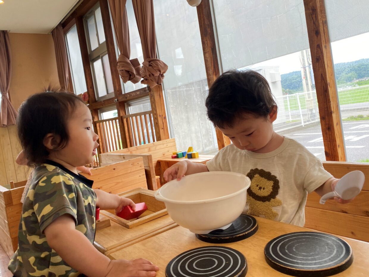 テラスや保育室で遊びました。テラスに飾ってある笹の葉に気が付き、周りに集まる子ども達!触ってみようとしたり、七夕の飾りも嬉しそうに見たりと、興味津々の様子でしたよ。また、保育室ではままごとをしたり、絵本を読んだりして楽しんでいました!