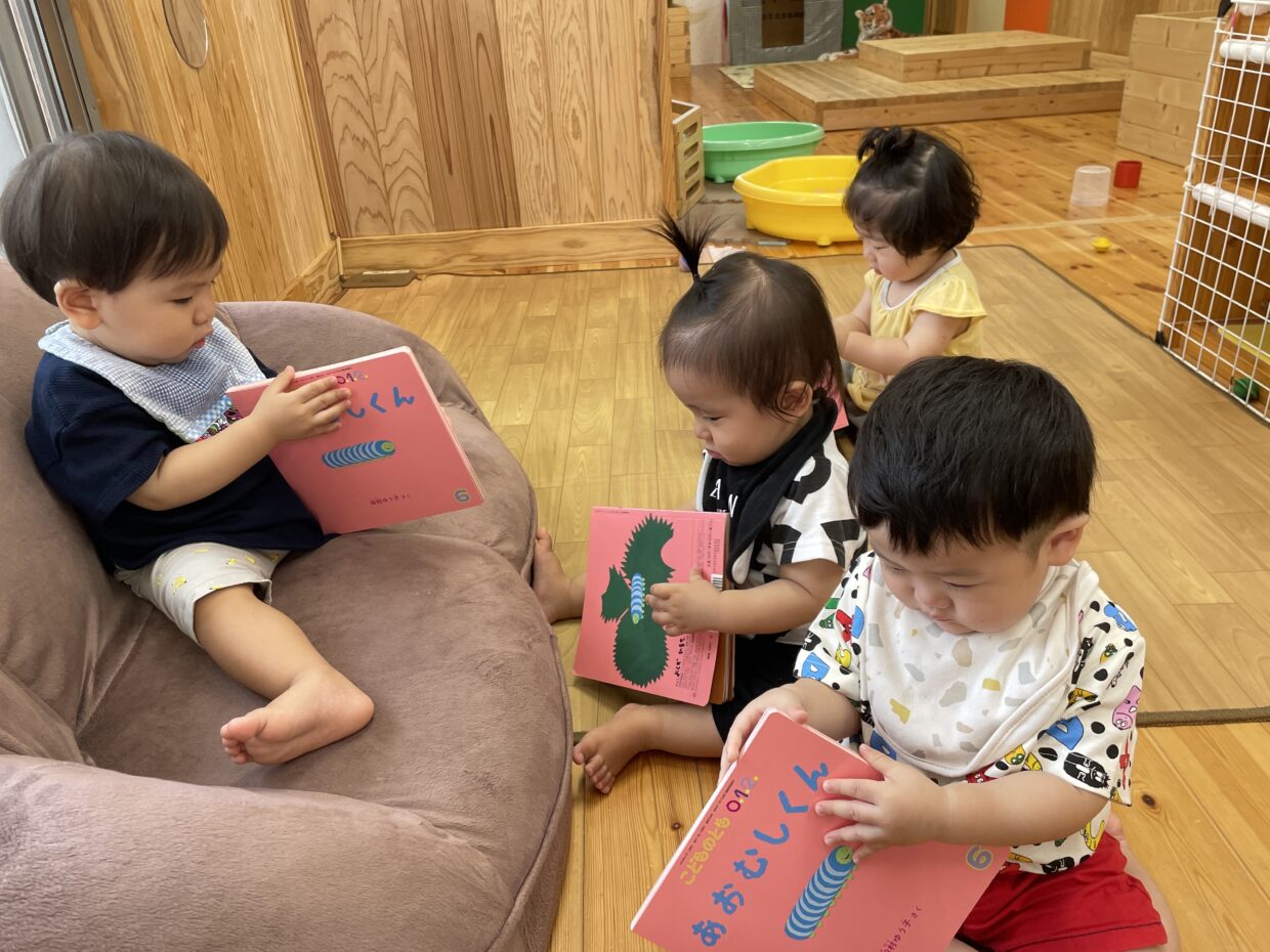 保育者と絵本を見ていると、次々に回りに集まり、一緒に絵本の時間を楽しむ子どもたち♪絵本を見たい時には、自分から絵本を取ろうとしたり、指差しで欲しいことを伝える様子も見られだしました。また、自分の月刊絵本を嬉しそうに受け取ると、じ~っと絵を見たり、何度もページを開いて楽しんでいます。
