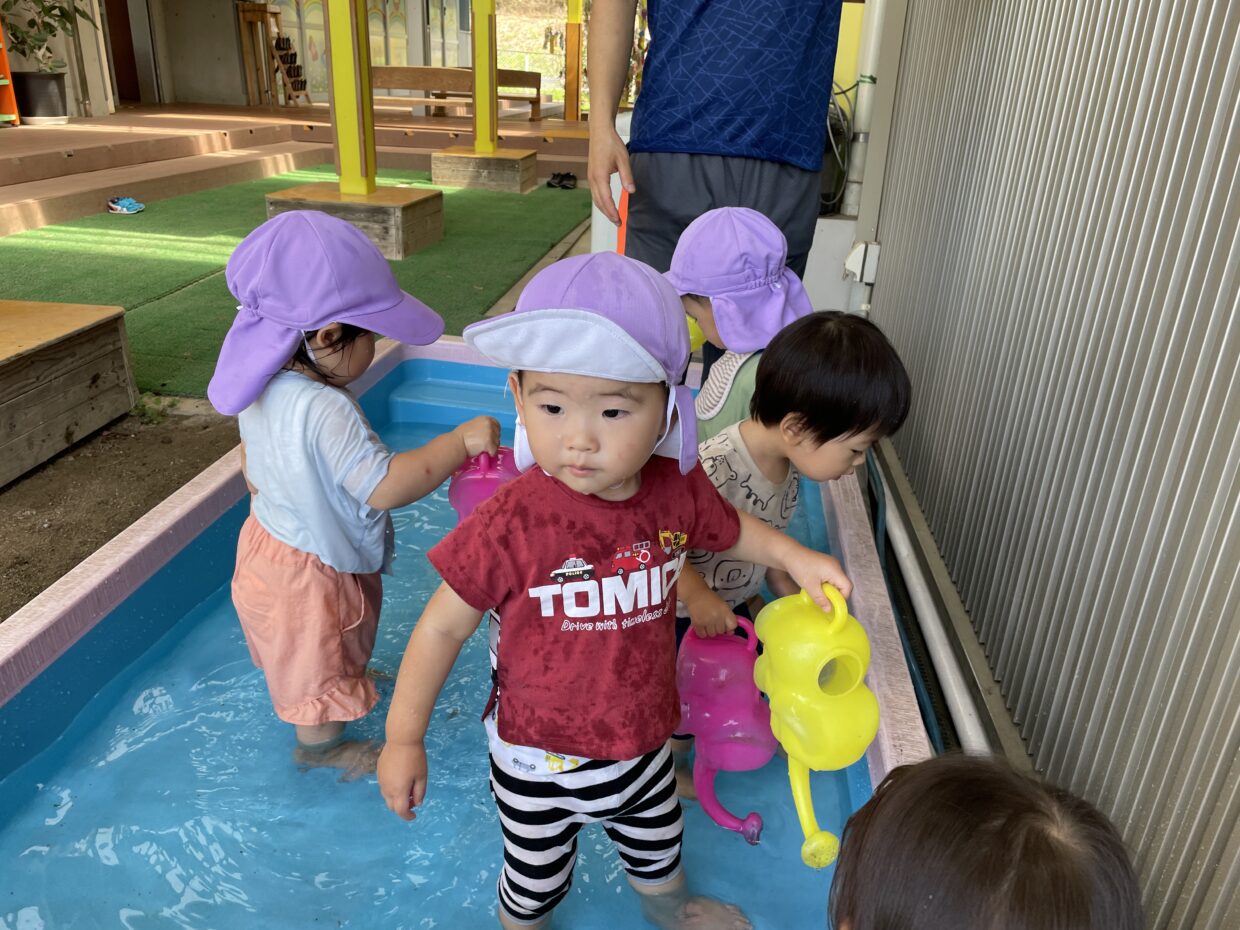 今月より、プール遊びが始まりました。初めての時は、少し嫌がったりする子どももいましたが、徐々に慣れていっているように感じます。プールの中に入ると、気持ち良さそうに水に触ったり、ジョウロに水を汲んだり、水をバシャバシャしたりして楽しんでいますよ!これからますます暑くなるので、水遊びやプール遊びをみんなで楽しんでいきたいと思います。