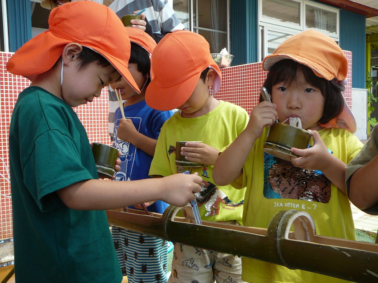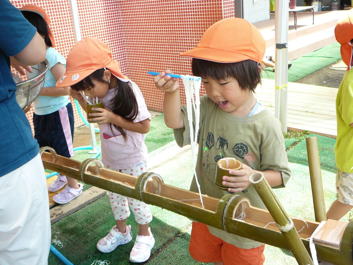 砂場で水路遊びをしていた友だちが「そうめん流しみたい」とつぶやいたことがきっかけでやることになりました。