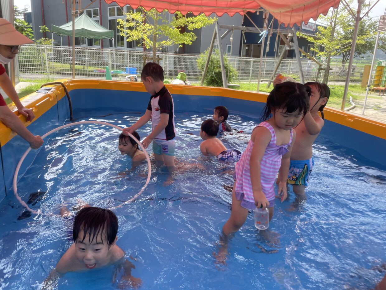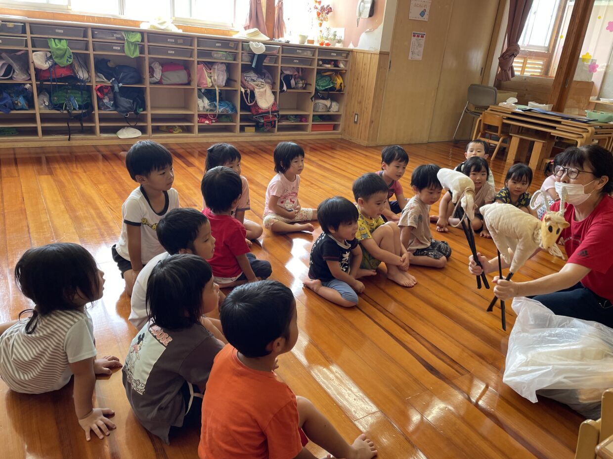 今日も暑い一日でしたね。子ども達は、プールに入りとても嬉しそうにしていました。プールでは、洗濯機ごっこをしたり、ペットボトルの玩具を使って遊びました。ペットボトルには穴が開いているので、シャワーにして自分の頭にかけているお友達もいましたよ。気持ち良さそうに遊んでいる様子が見られました。プール遊びが大好きなきりん組さんです。プールから上がった後は、「三びきのやぎのがらがらどん」を見ました。「やぎさんどこから来たん?」と可愛いやぎさんに興味津々の子ども達でした。