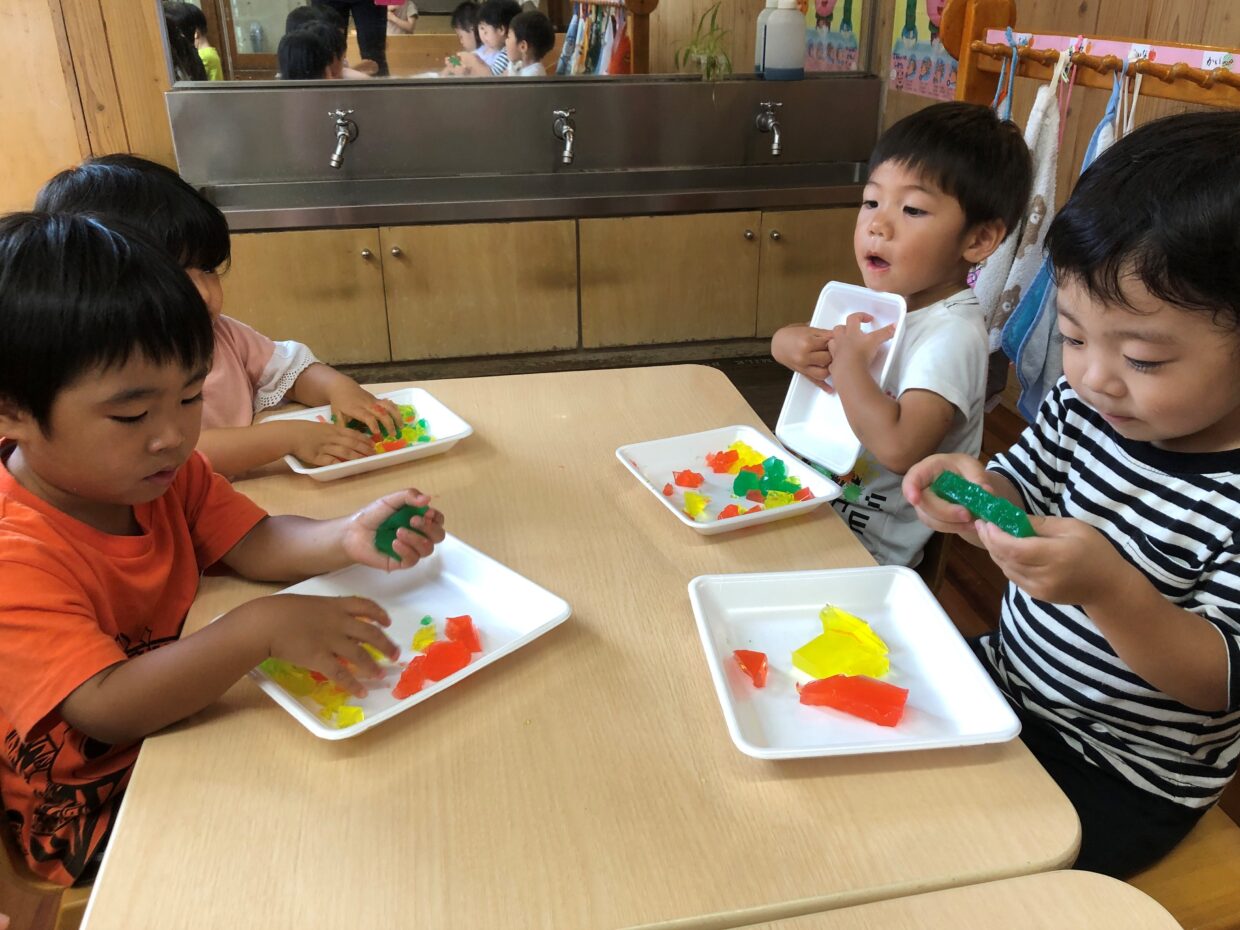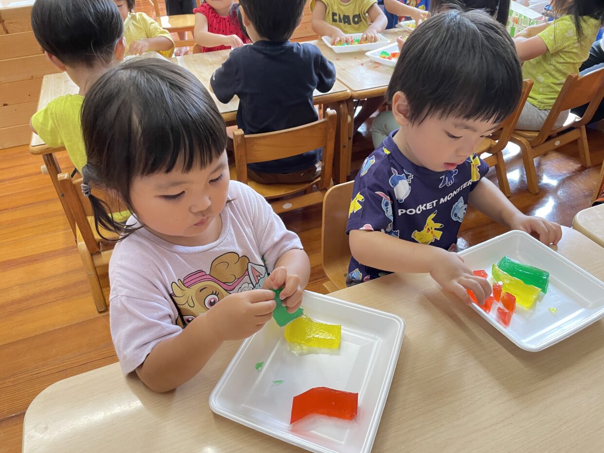 触ってみると「冷たい!」「ぐちゃぐちゃ~」「見てみて」と感触を楽しんでいましたよ♪潰した寒天を別の容器に入れてひっくり返し!「ゼリーできたよ」と嬉しそうに見せてくれました!まだまだ暑い日が続くので、楽しい遊びをしながら乗り越えていきたいと思います!