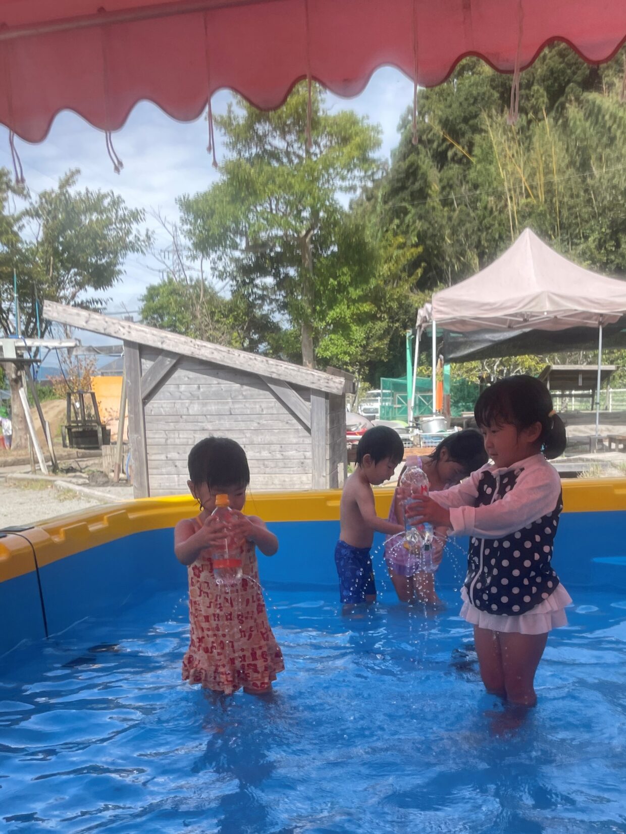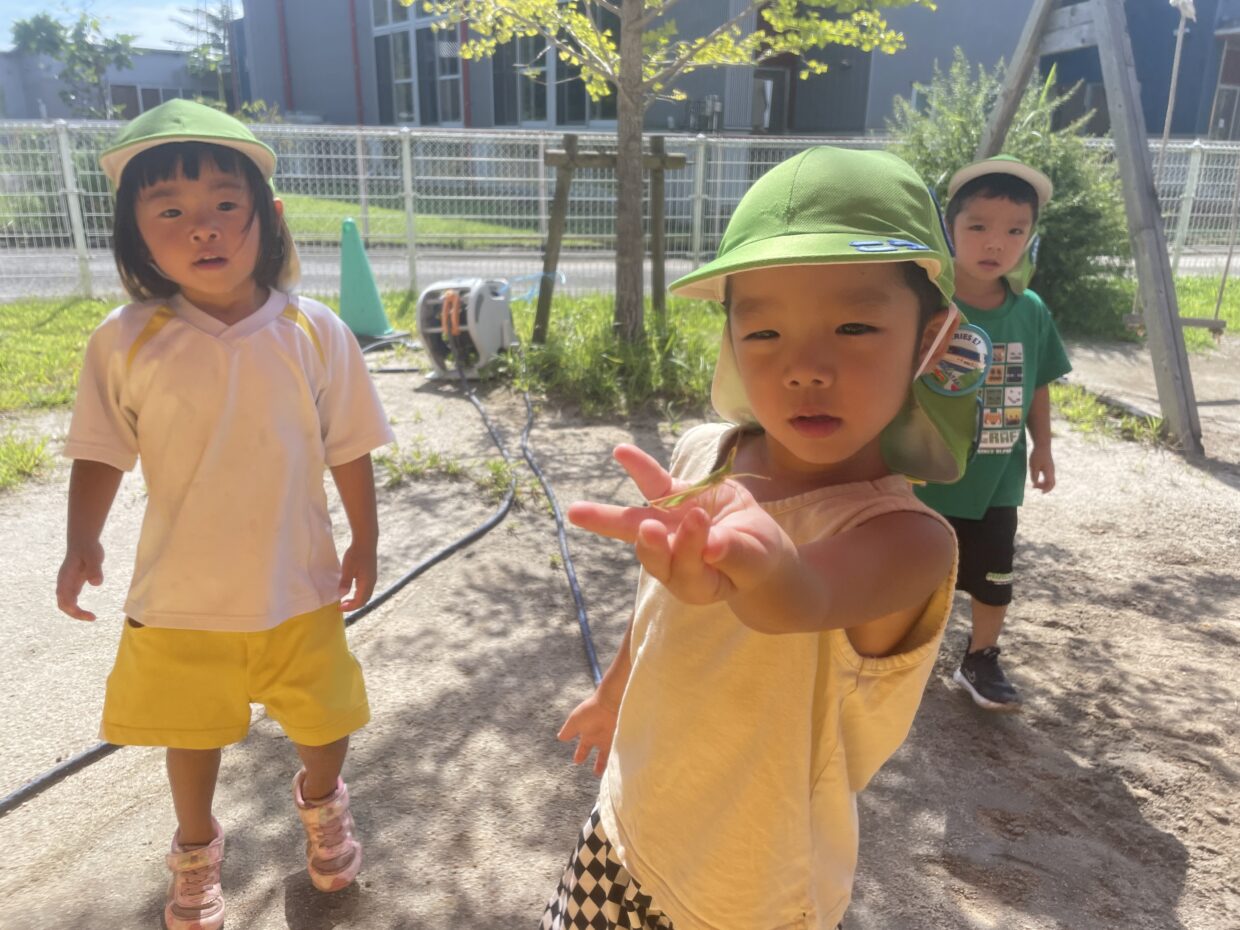 今日は、プール遊びをしました。「ミーン、ミーン」と鳴くセミの声を聞き、プールの中から一生懸命セミの姿を探している様子が見られました。また、バッタを見つけて様子を見ている友達もいましたよ!
