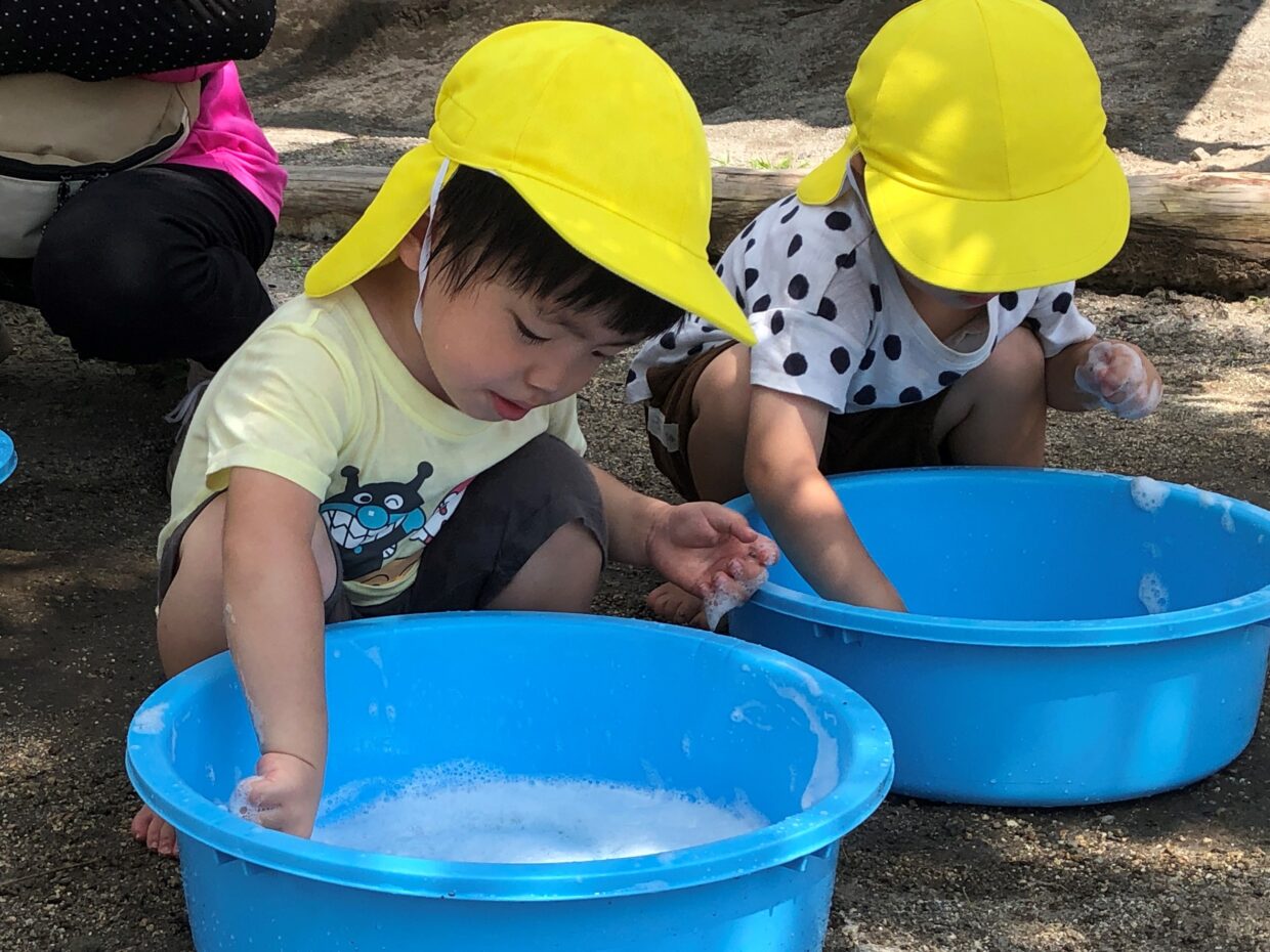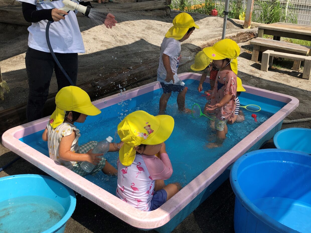 プールでは、金魚すくいごっこやペットボトルシャワーをしたり、タライを使い、泡遊びを友達や保育者と一緒に夢中になって楽しむ姿が見られていましたよ。