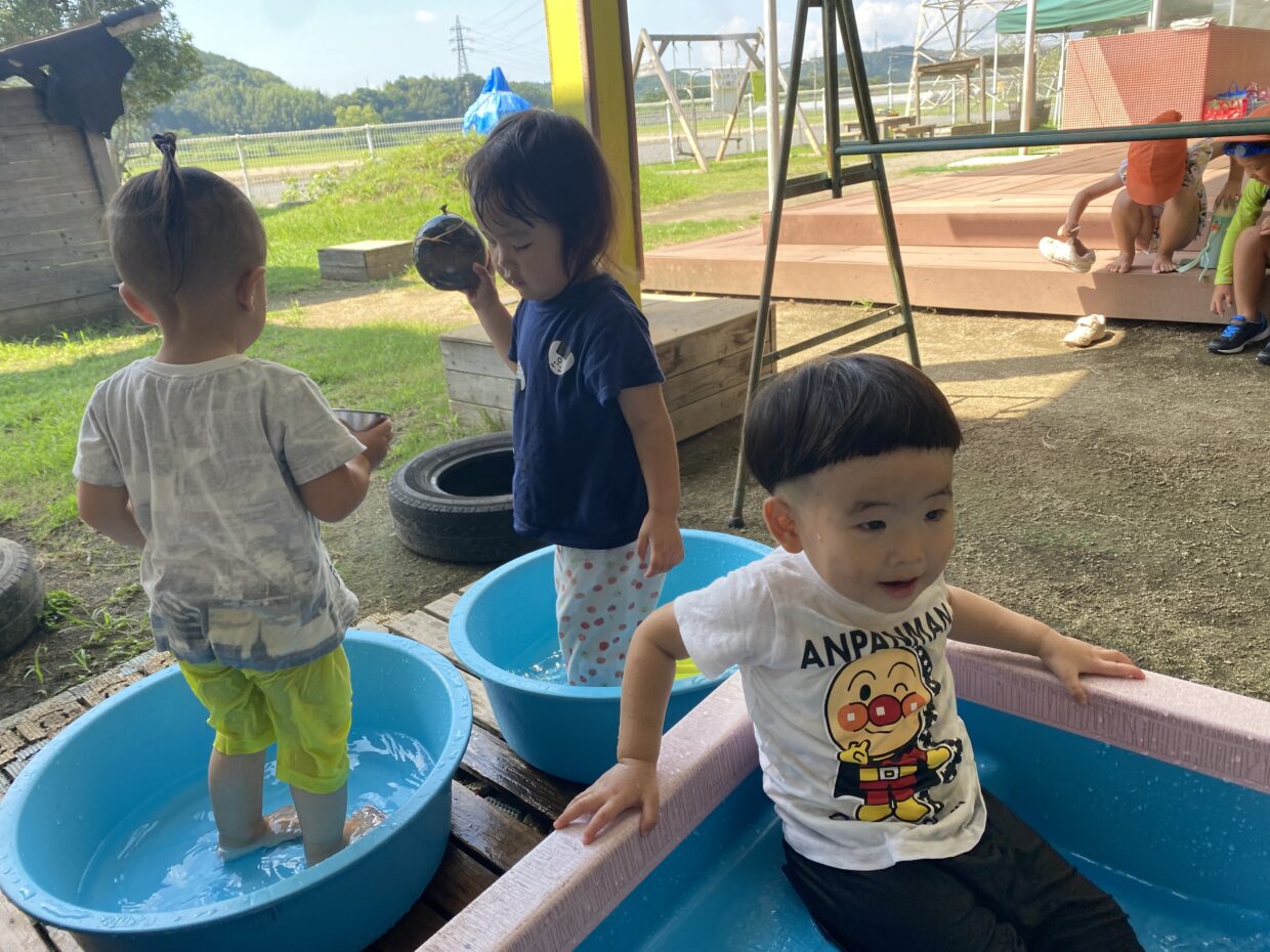 毎日、暑い日が続いていますね。天気の良い日には、水遊びやプール遊びをしている子どもたち。顔にかかるのを嫌がったりする子どもはいますが、ジョウロやカップに水を入れてみたり、タライの中に入ったり、それぞれの楽しみ方で遊んでいます。シャボン玉にも興味津々で手で触ろうとしてみたり、飛んでいく様子を嬉しそうに眺めたりしています。