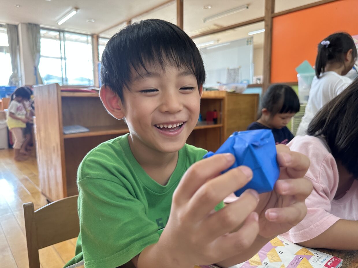 また、折り紙をする子も多く、友だちや保育者に折り方を聞きながら作ったり、自分でおりがみの本を見ながら作る姿が見られます!自分で作り方が分かるようになると、「わからない」と困っている友だちに声を掛け、教えてあげる優しい姿が見られますよ。