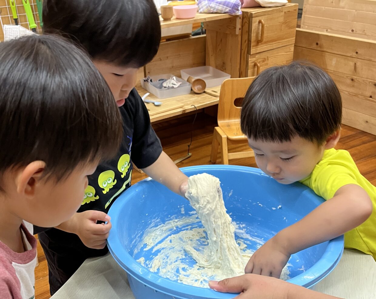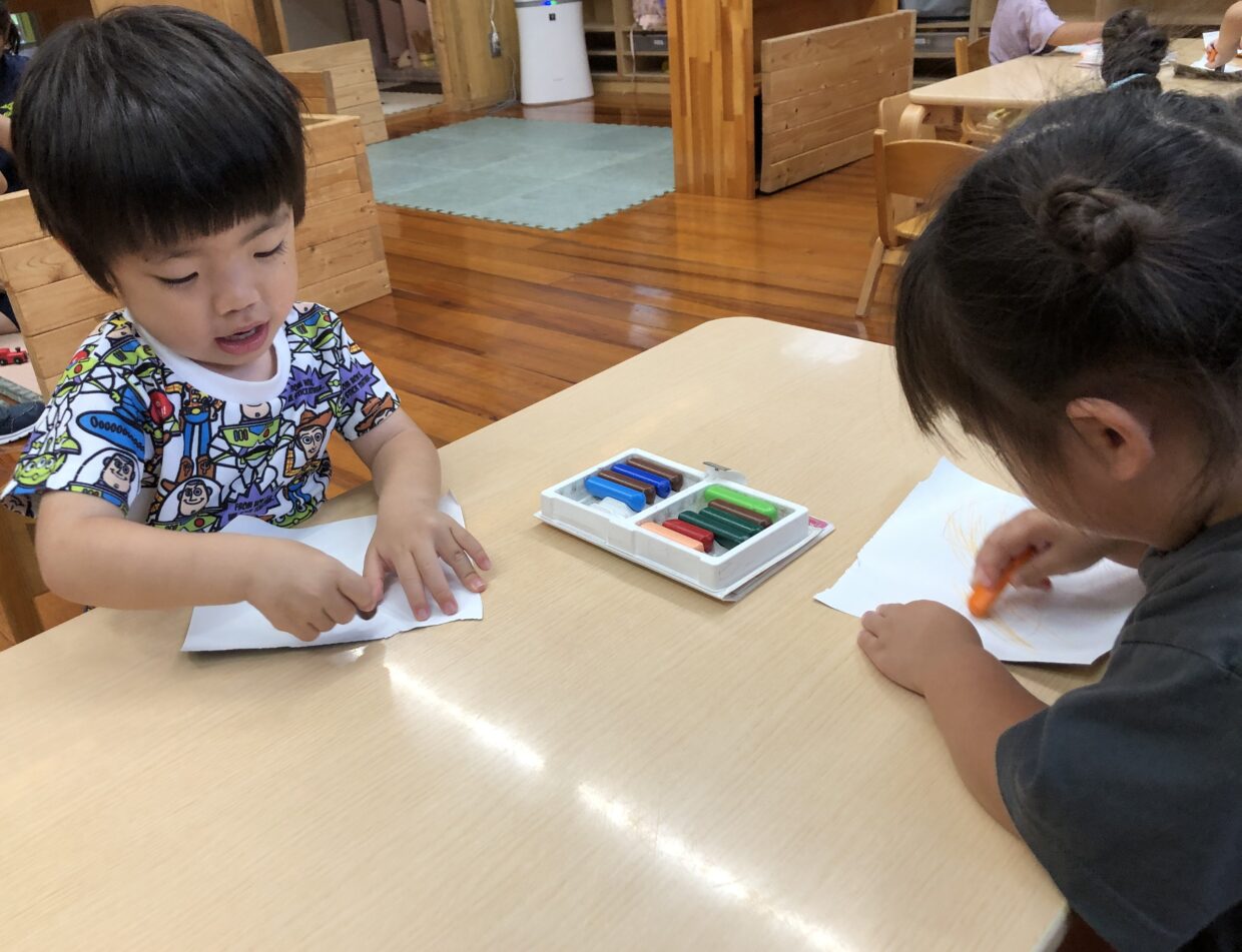 こあら組のお部屋では、小麦粉粘土やジャンピングマットなどをしました。小麦粉粘土の感触を楽しんでいましたよ。うさぎ組のお部屋ではお絵描きをしたり、ダンスをしました。自分の好きな色のクーピーを使い、集中して描いていましたよ。