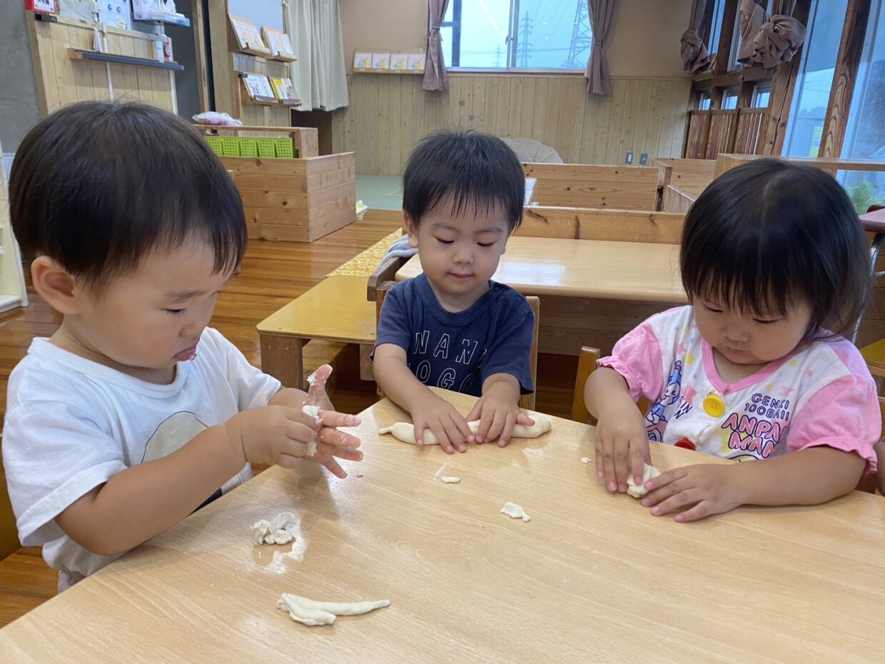 今日から9月のスタートですね!今週は、雨の日が多く、室内で過ごすことが多かったです。小麦粉ねんどをしましたよ。ねんどを小さくちぎったり、こねたり、伸ばしたりと楽しんでいました!ねんどを長ーく伸ばして、嬉しそうに保育者に見せてくれる友だちもいました♡