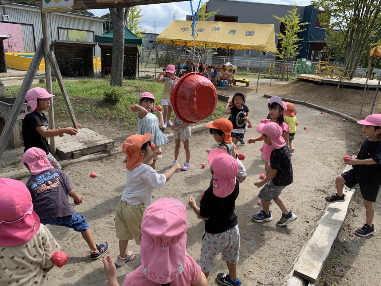 今日は「すずわり」という種目をしました。チームに分かれて、どちらが先にくす玉を割れるか!子どもたちも真剣に取り組んでいました!玉を投げて、上手に当てていましたよ♪