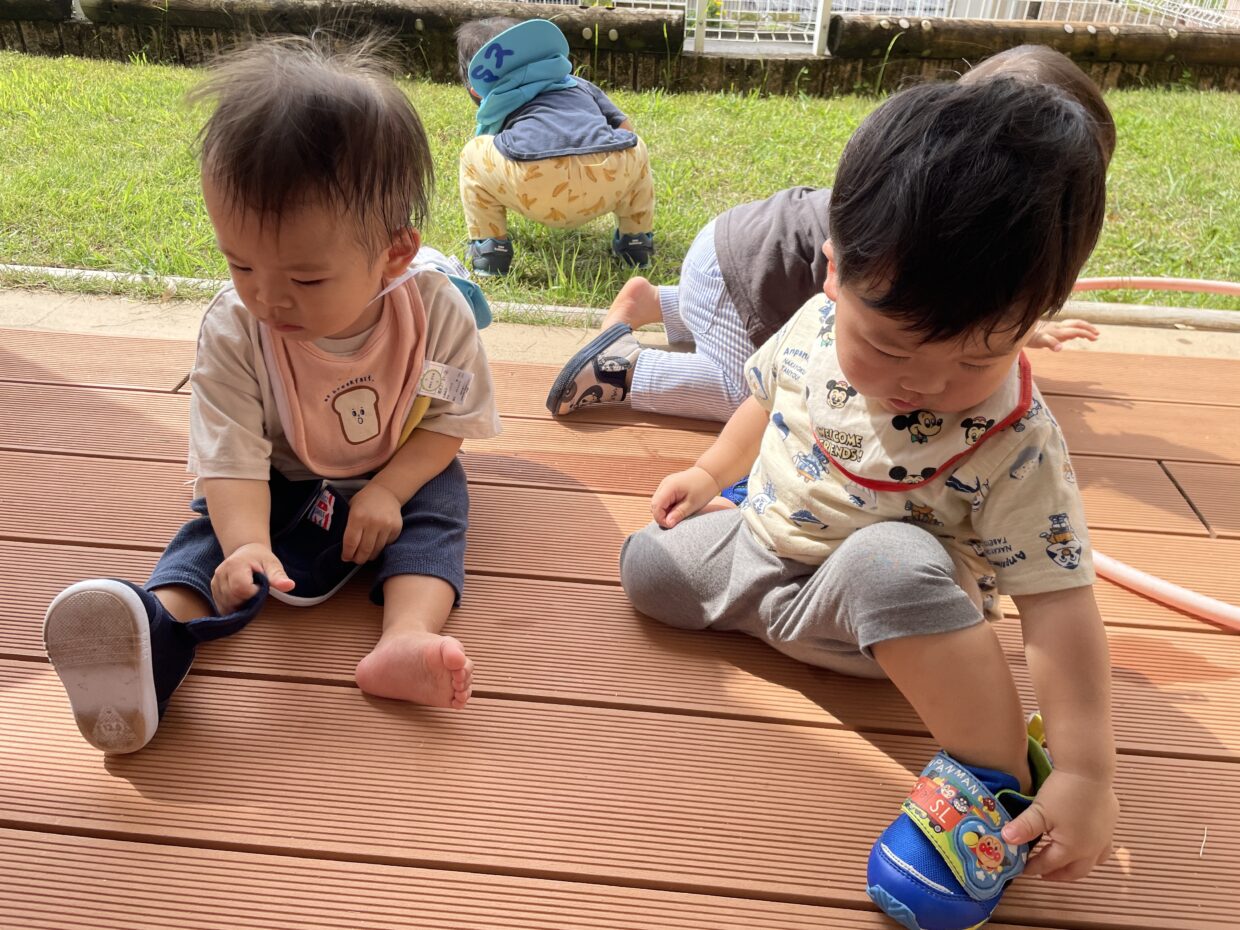 だんだんと歩けるようなってきた子どもたち。テラスに出る時には、靴を履いて遊んでいます!慣れずに、履いてもすぐに脱いでいた子どもも、徐々に慣れてきて、自分の靴を見つけると、持って座る姿が見られていますよ。