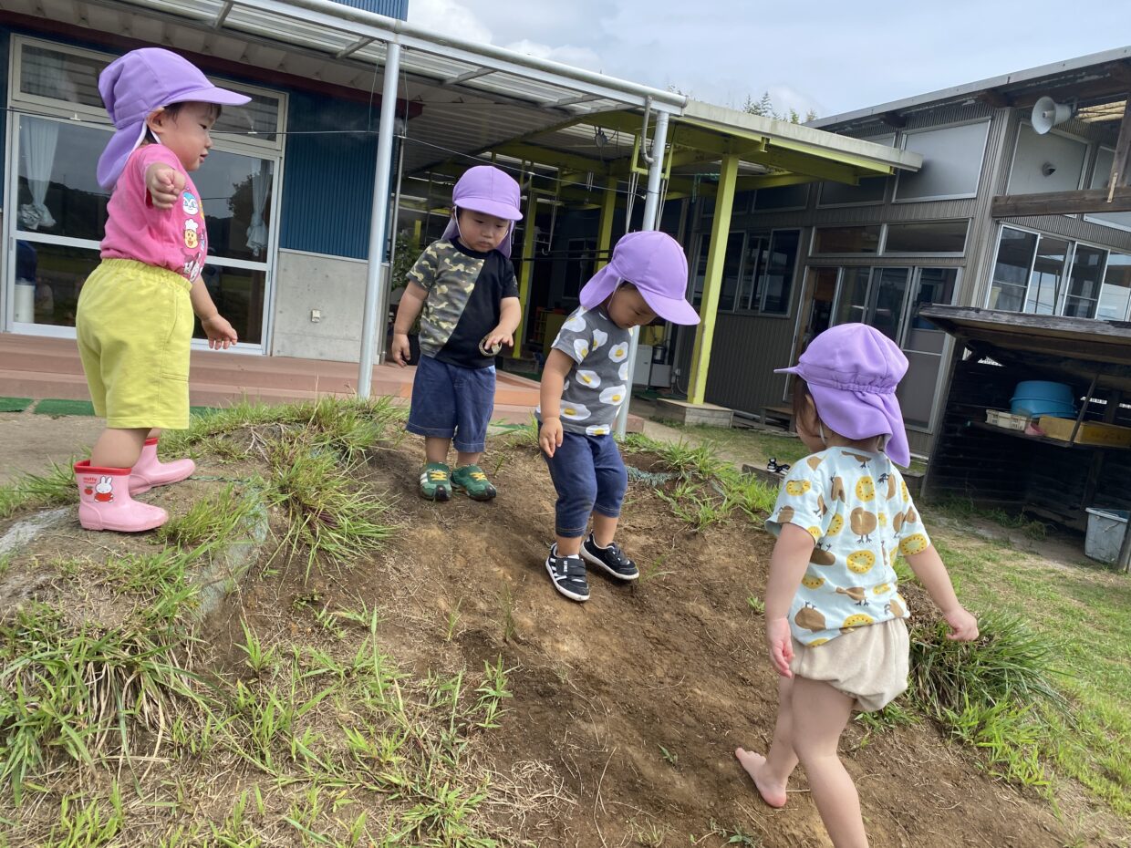 朝夕は少しずつ涼しくなってきましたが、まだまだ暑い日が続いていますね。今週は天気の良い日には、ミニ園庭に行って遊びました。友だちと一緒に築山に登ったり、トラックの乗り物に乗ったりして体を動かしたりしていました。また、保育者が飛ばすシャボン玉にも興味津々で跳んでいく様子を眺めたり、追いかけたり楽しんでいた子どもたちです。