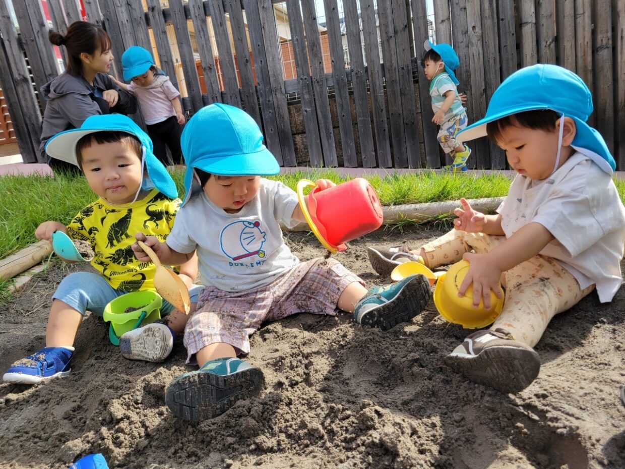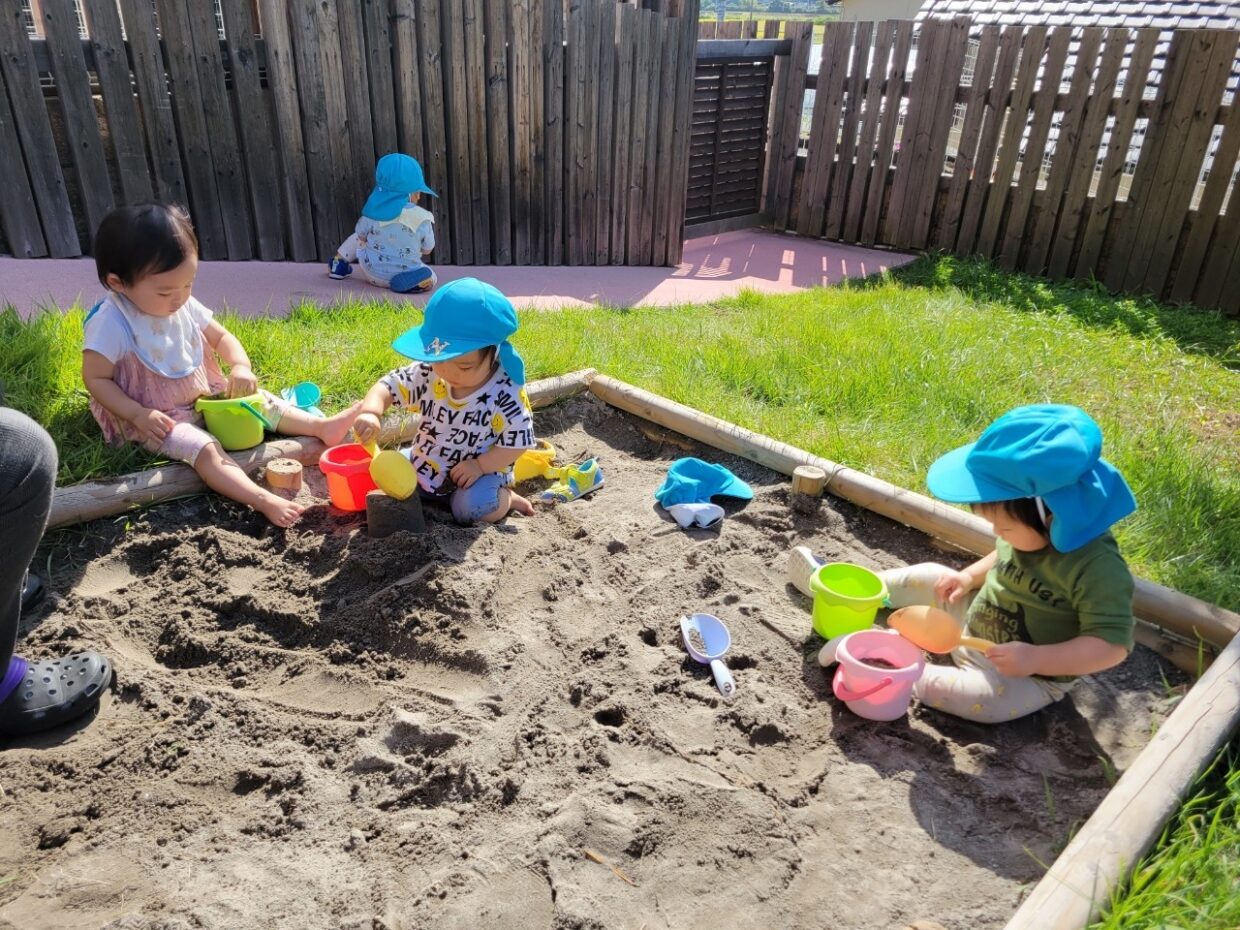 外遊びが大好きなひよこぐみの子どもたち。前庭に行っては砂場やスロープで楽しく遊んでいます。最初は少し砂を触ってみようとする姿や、スコップの使い方も分からない様子が見られていました。何度も遊んでいく事で、最近では自分たちで砂場に行き、スコップで砂をすくってバケツに入れたり、手で握ったりして楽しんでいます♪保育者がバケツでケーキを作ると、嬉しそうに笑いながらやってきて手でこわして喜んでいます!