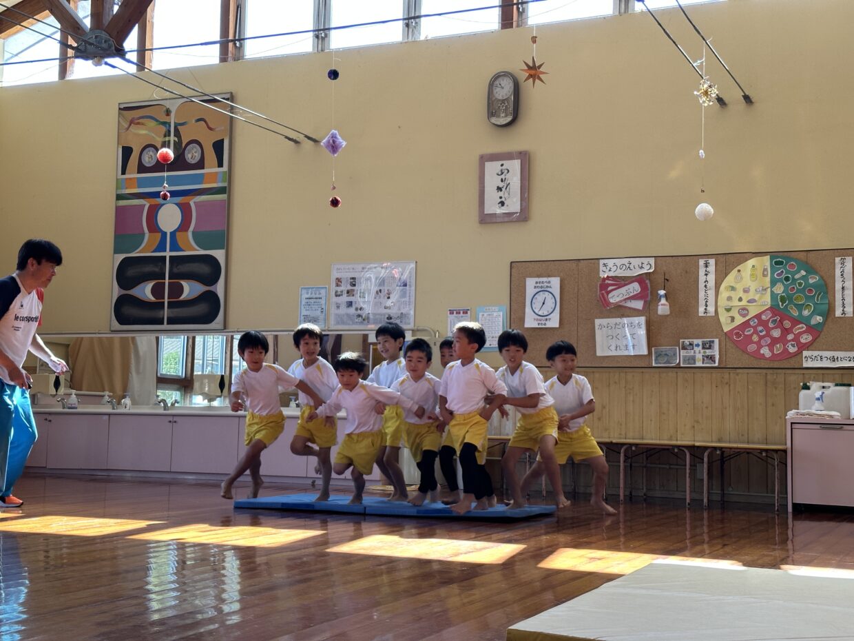 先生が言った数字のマットに素早く移動したり、足にボールを挟んだまま前転をしたりと、集中して取り組んでいましたよ。また、長縄が揺れるのを上手に飛び越えたり、回っている下をくぐることができた友だちもいましたよ!