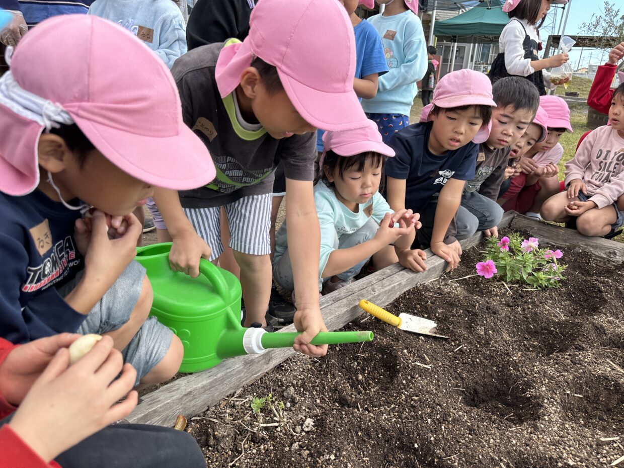 今日は、ミニ園庭の花壇にチューリップの球根を植えました。保育者が「チュウリップはどの向きに咲くかな?」と問いかけると「上向き!」と言い、みんな一つずつ手に取り、球根のとんがっている所が上になるようにして、優しく土をかけていた子どもたちです。