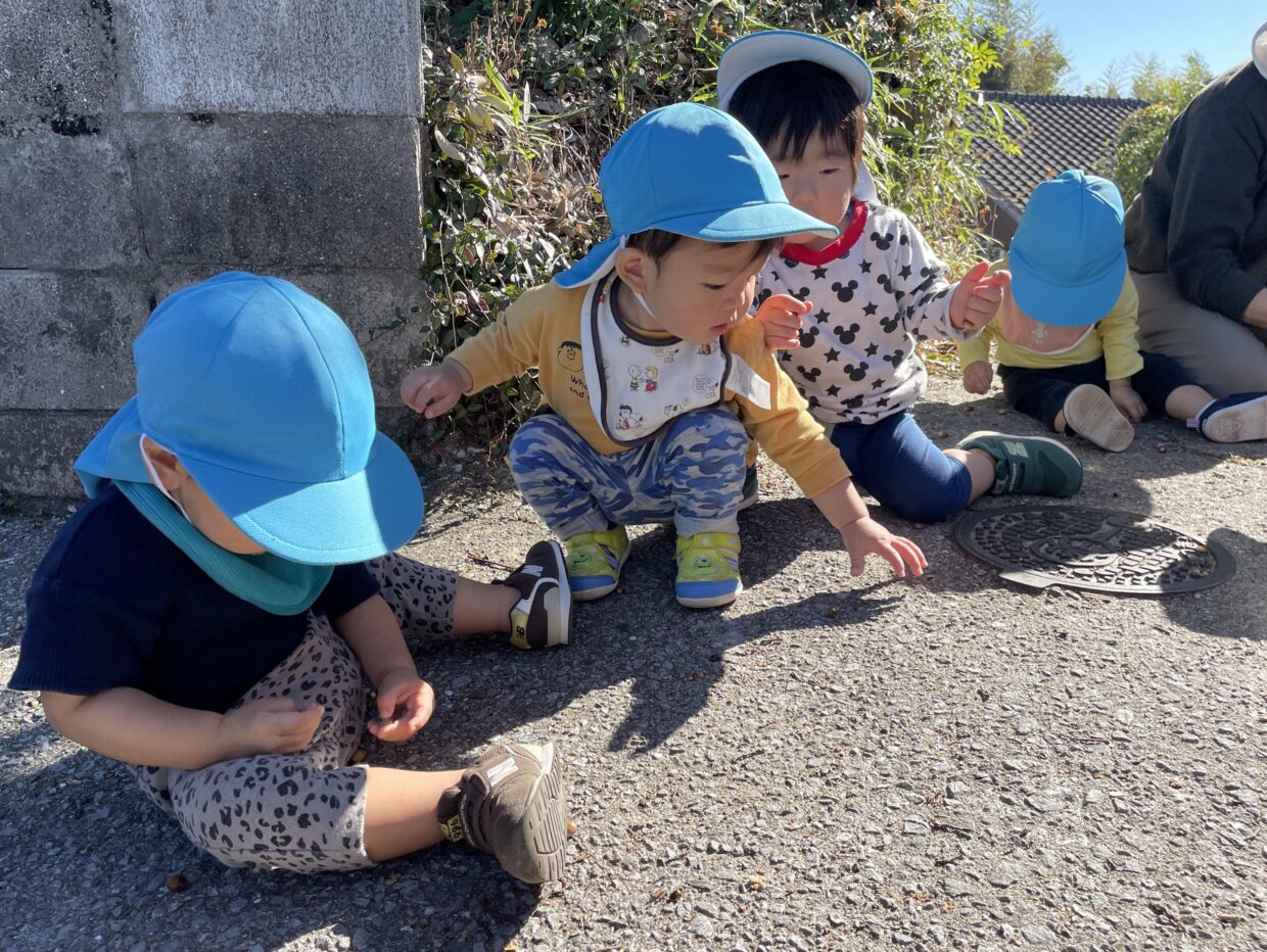 どんぐりを拾いに散歩に行きました!どんぐりを不思議そうに触ったり、手いっぱいに拾おうとしたりする子どもたち。また、広い場所では、草花や落ち葉に触れて感触を楽しんだり、歩行を喜ぶ姿が見られましたよ♪