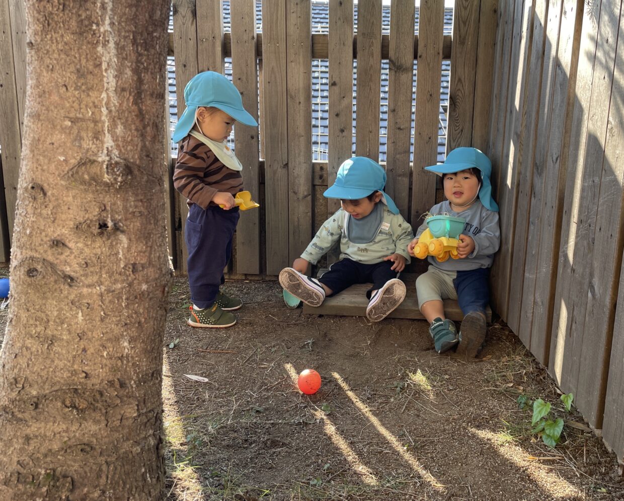最近はお庭のベンチがお気に入りスポット♪1人で座ってくつろいでいると、友だちが集まり気付けば数人で楽しそうに座っています。友だちと顔を見合わせて嬉しそうに笑ったり、興味津々で持っている物を覗いたりと色々な姿が見られています。