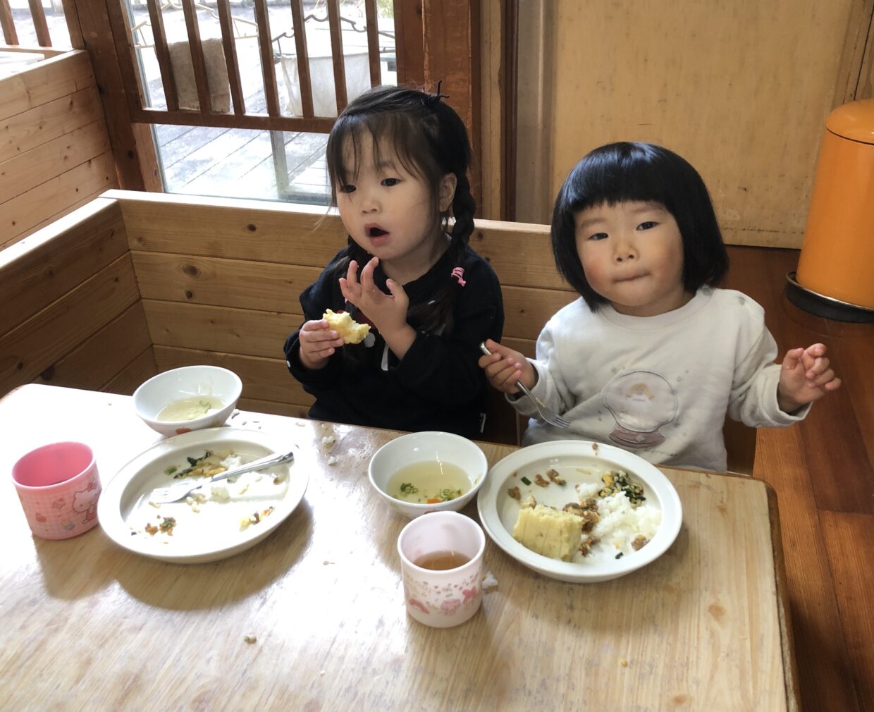 その後、園庭で遊び、給食の時に焼きあがったケーキを喜んで食べていました。「おいし~い!」とおかわりをしていましたよ♪