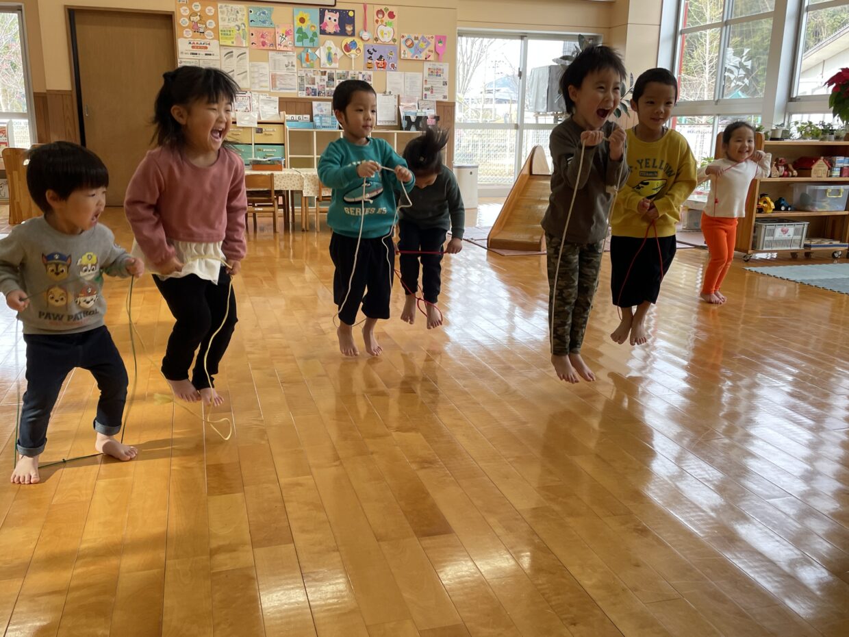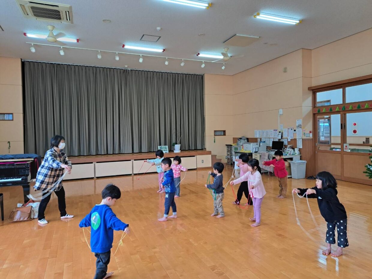 今日は、リトミックがありました。好きな楽器を持ちピアノの音に合わせて鳴らしたり、ボールを使ったりして遊びました。また、ロープを使った遊びでは、ロープを回したり、形を作ってみたり、飛んだりして楽しんでいる様子が見られましたよ。友だちと一緒に楽しみながら遊んでいました☆リトミックの後はクリスマスの製作をして遊びましたよ!