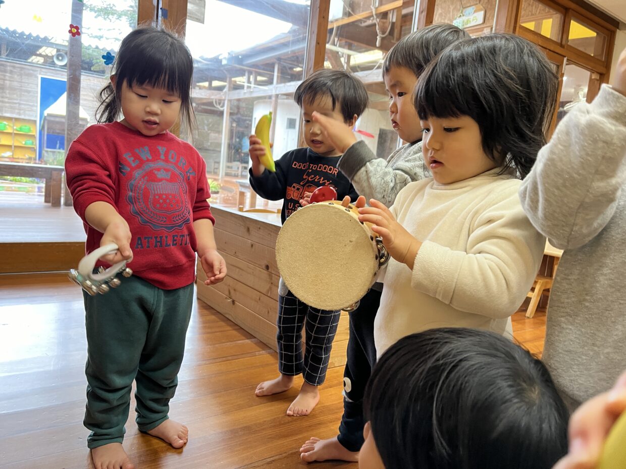 みんな初めての楽器に興味津々、使い方を伝えると嬉しそうに楽器を選んでいました。タンバリン・スズ・カスタネットなどお友達と交代して、音の違いを楽しむお友達もいました。子ども達がリクエストしたどんぐりころころやアイアイに合わせて上手に楽器を鳴らしていましたよ。